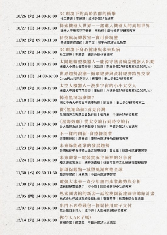 桃園市立圖書館10月26日至12月14日「未來˙學」活動海報及課程資訊