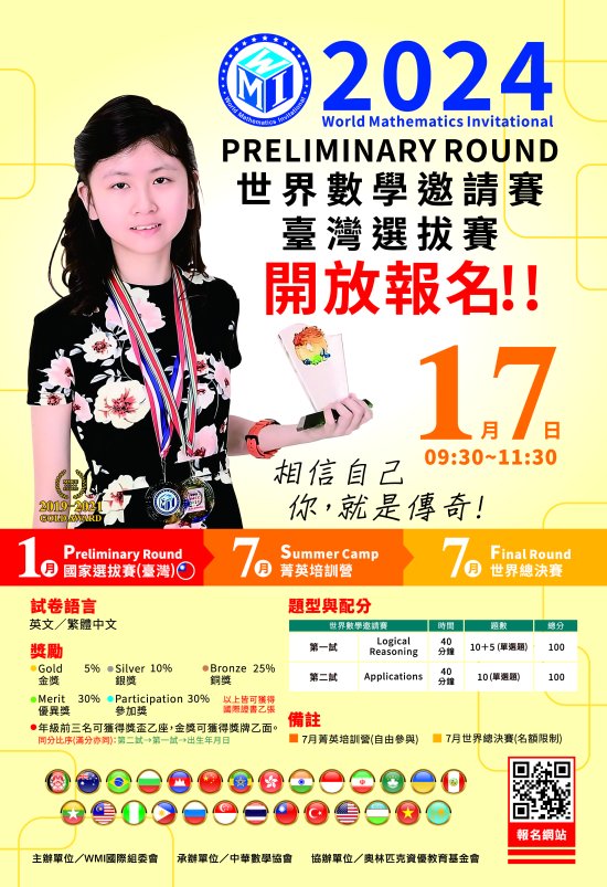 三、 | 「WMI世界數學邀請賽-2024臺灣選拔賽」,凡就讀臺灣各縣市之公私立幼兒園至高中三年級之我國籍在學學生,均可報名參加,歡迎愛好數學的學生們踴躍報名,一同響應,為台灣爭取榮耀。 |